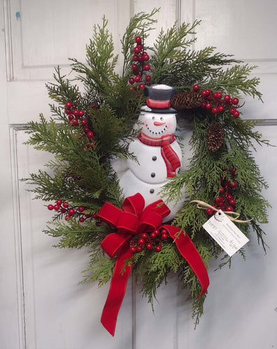 PM94 - Winter Greenery Wreath With Snowman Accented Bow