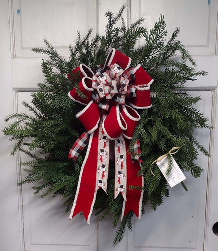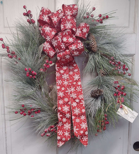 PM88 - Winter Snowy Pine Wreath with Red Berries & Red/White Snowflake Bow