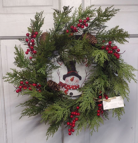 PM87 - Winter Greenery Wreath with Red Berries & Tin Snowman