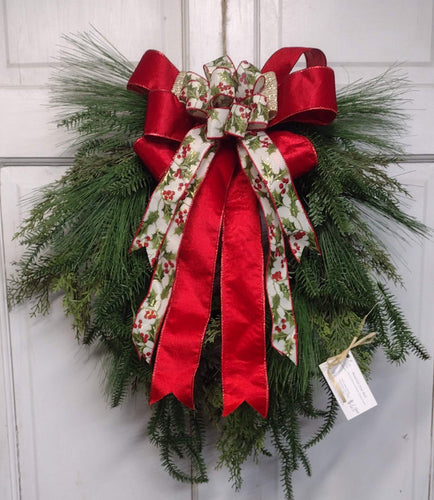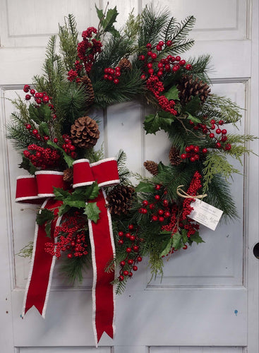 PM95 - Winter Wreath with Red Berries & Pine Cones & Horizonal Red Bow